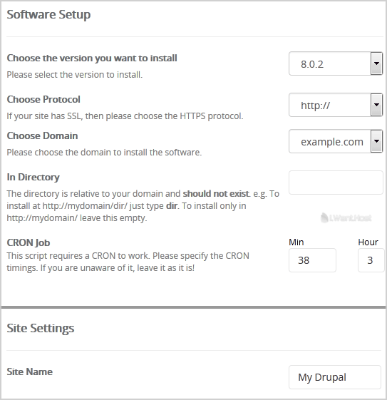 • In Directory: If you want to install this in a directory, for example example.com/directory, enter the directory name. Otherwise, leave this blank to install in your main domain example.com